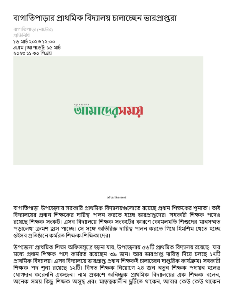 বাগাতিপাড়ার প্রাথমিক বিদ্যালয় চালাচ্ছেন ভারপ্রাপ্তরা – Dainik Amader Shomoy.pdf Published on 16 March 2023 Newspaper দৈনিক আমাদের সময় Category General Education General Education Download