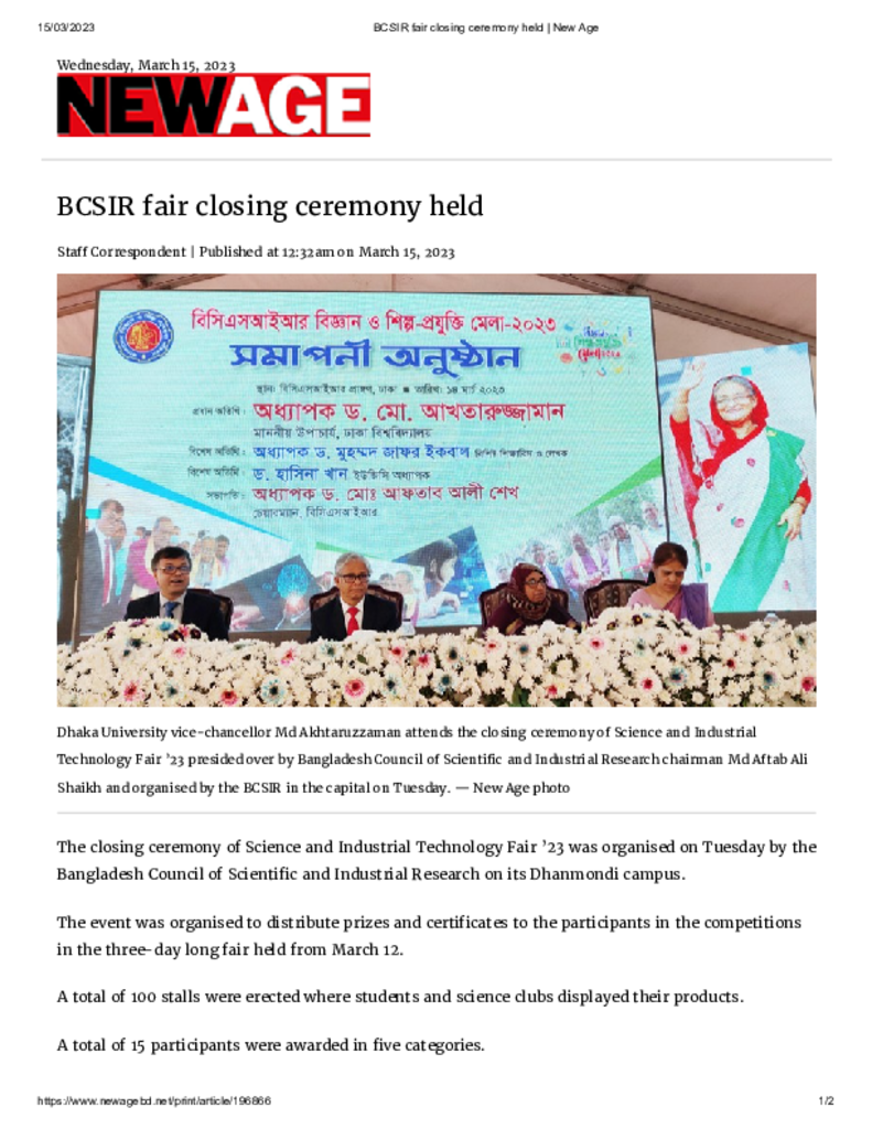 BCSIR fair closing ceremony held _ New Age Published on 15 March 2023 Newspaper New Age Category Science Education Download
