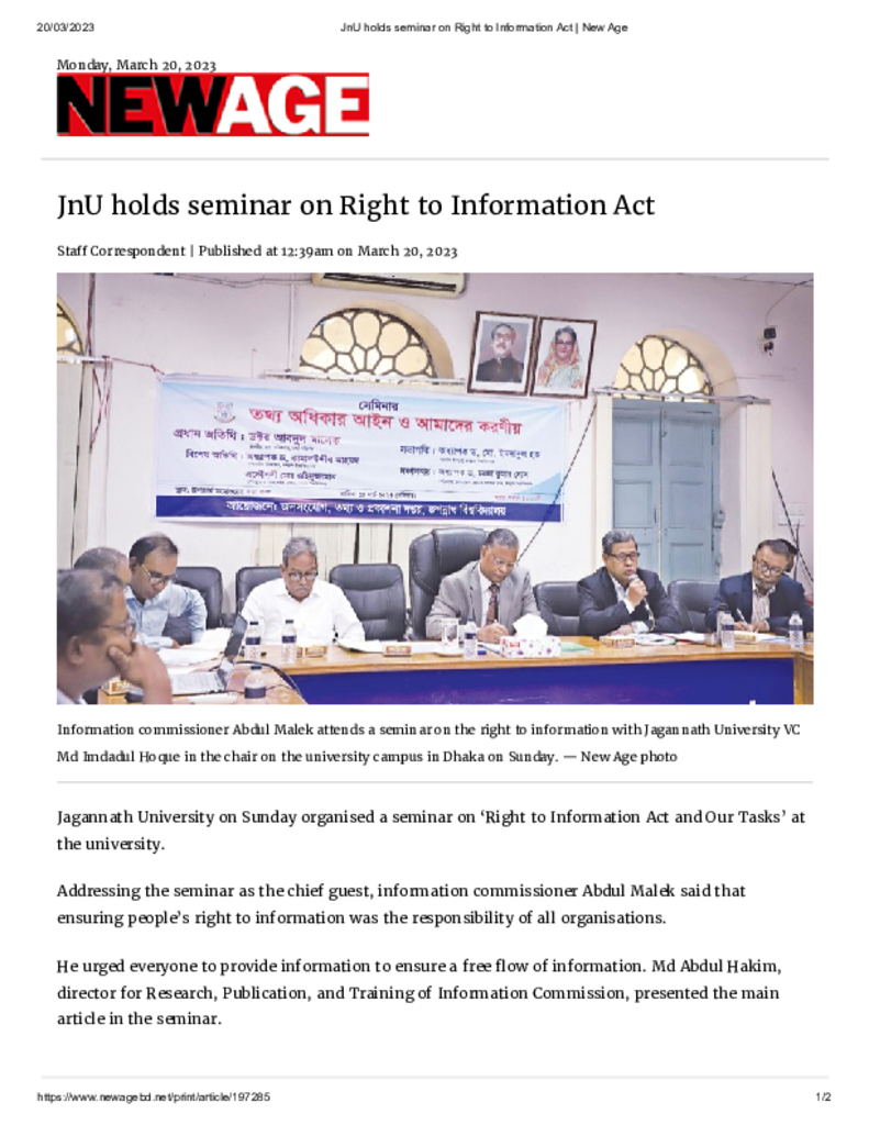 JnU holds seminar on Right to Information Act _ New Age Published on 20 March 2023 Newspaper New Age Category ICT Education Download
