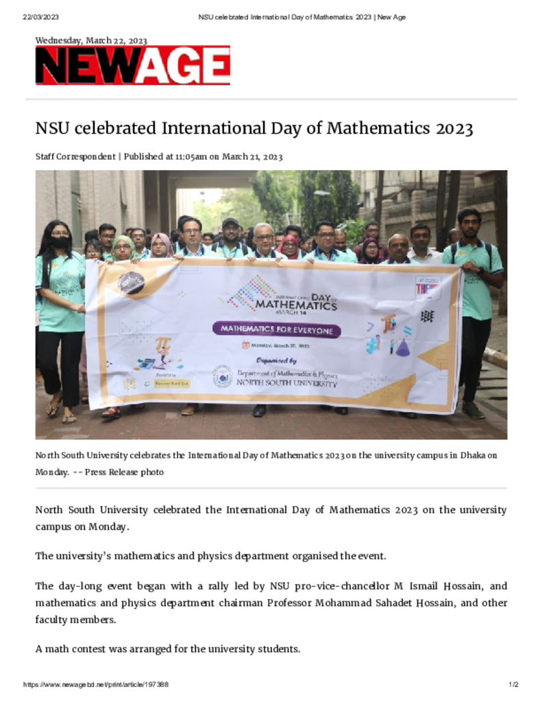 NSU celebrated International Day of Mathematics 2023 _ New Age Published on 21 March 2023 Newspaper New Age Category Science Education Download