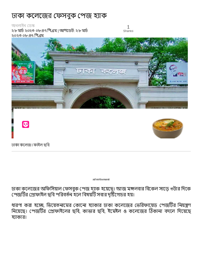 ঢাকা কলেজের ফেসবুক পেজ হ্যাক – Dainik Amader Shomoy.pdf Published on 28 March 2023 Newspaper দৈনিক আমাদের সময় Category Others General Education Download