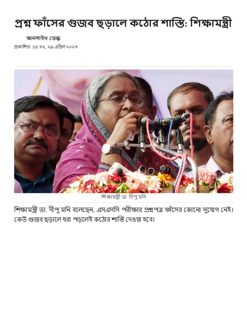 প্রশ্ন ফাঁসের গুজব ছড়ালে কঠোর শাস্তি_ শিক্ষামন্ত্রী.pdf Published on 29 April 2023 Newspaper দৈনিক জনকণ্ঠ Category Educational Ministry / Departments Public Examination SSC Download