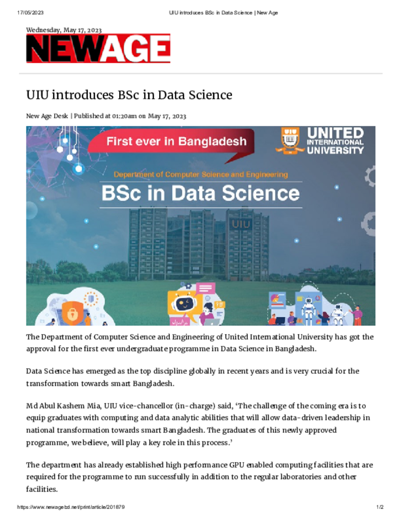 UIU introduces BSc in Data Science _ New Age Published on 17 May 2023 Newspaper New Age Category Science Education Download