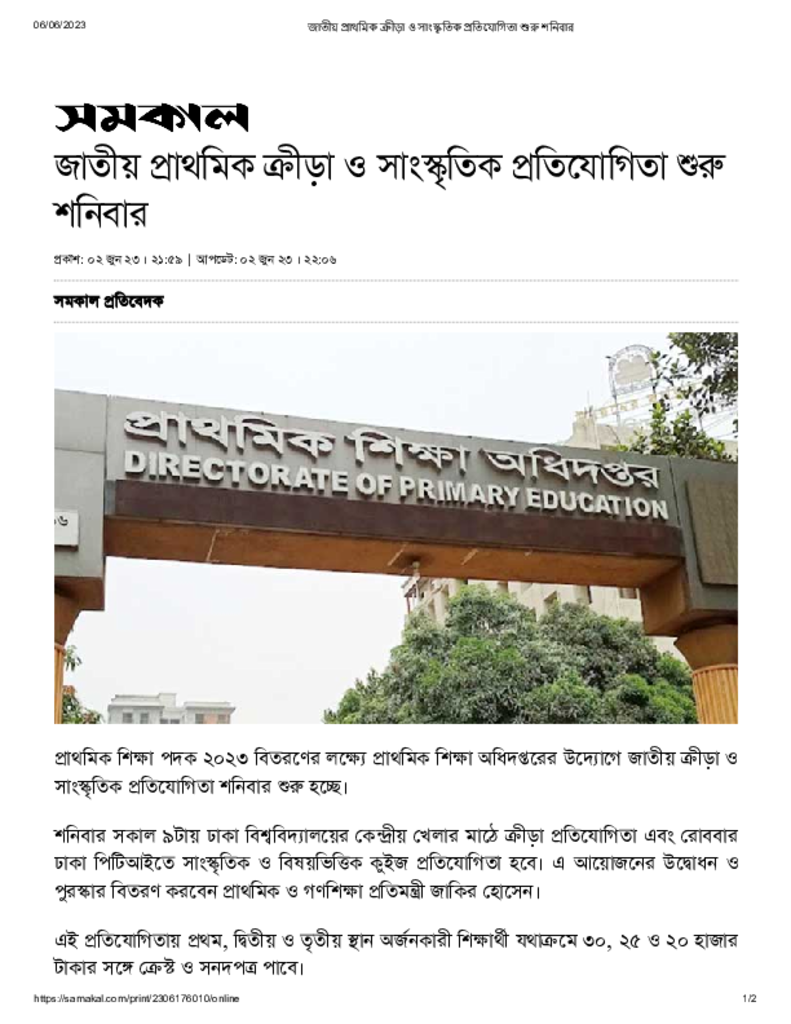 জাতীয় প্রাথমিক ক্রীড়া ও সাংস্কৃতিক প্রতিযোগিতা শুরু শনিবার