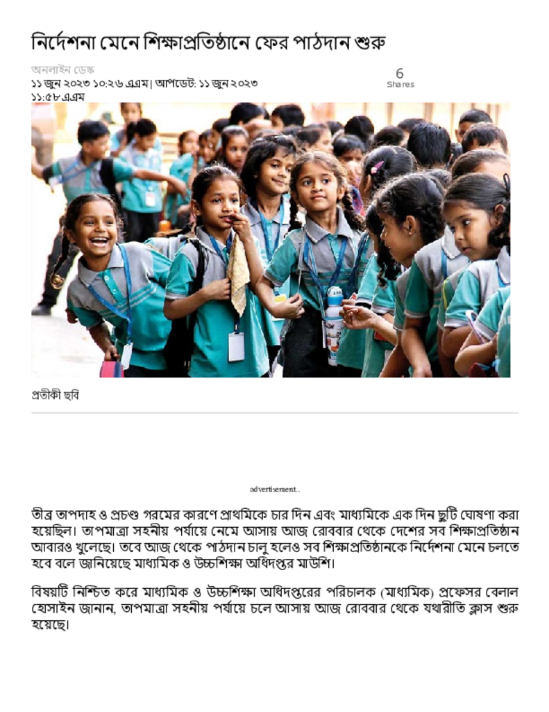 নির্দেশনা মেনে শিক্ষাপ্রতিষ্ঠানে ফের পাঠদান শুরু – Dainik Amader Shomoy.pdf Published on 11 June 2023 Newspaper দৈনিক আমাদের সময় Category Educational Ministry / Departments Download