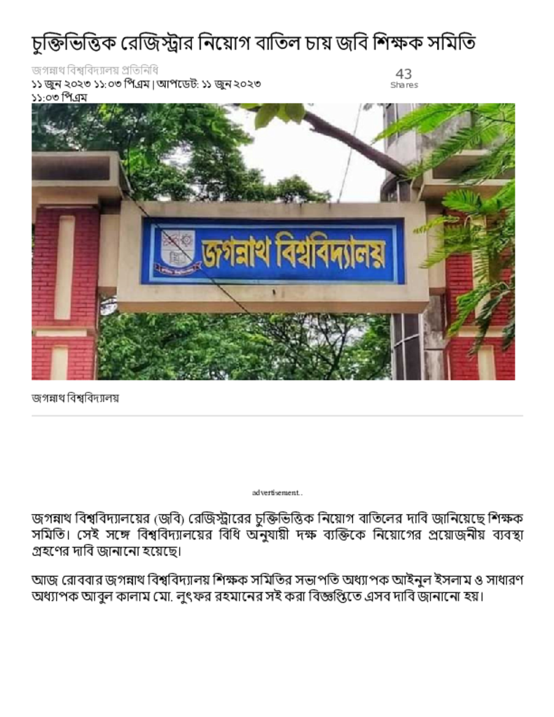 চুক্তিভিত্তিক রেজিস্ট্রার নিয়োগ বাতিল চায় জবি শিক্ষক সমিতি – Dainik Amader Shomoy.pdf Published on 11 June 2023 Newspaper দৈনিক আমাদের সময় Category General Education General Education Download