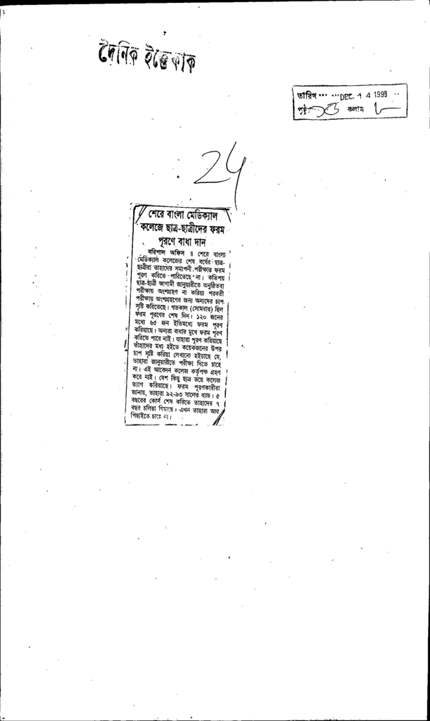 শেরে বাংলা মেডিকেল কলেজে ছাত্র-ছাত্রীদের ফরম পূরণে বাধা দান Published on Newspaper দৈনিক ইত্তেফাক Category Professional Education Professional Education Medical Download