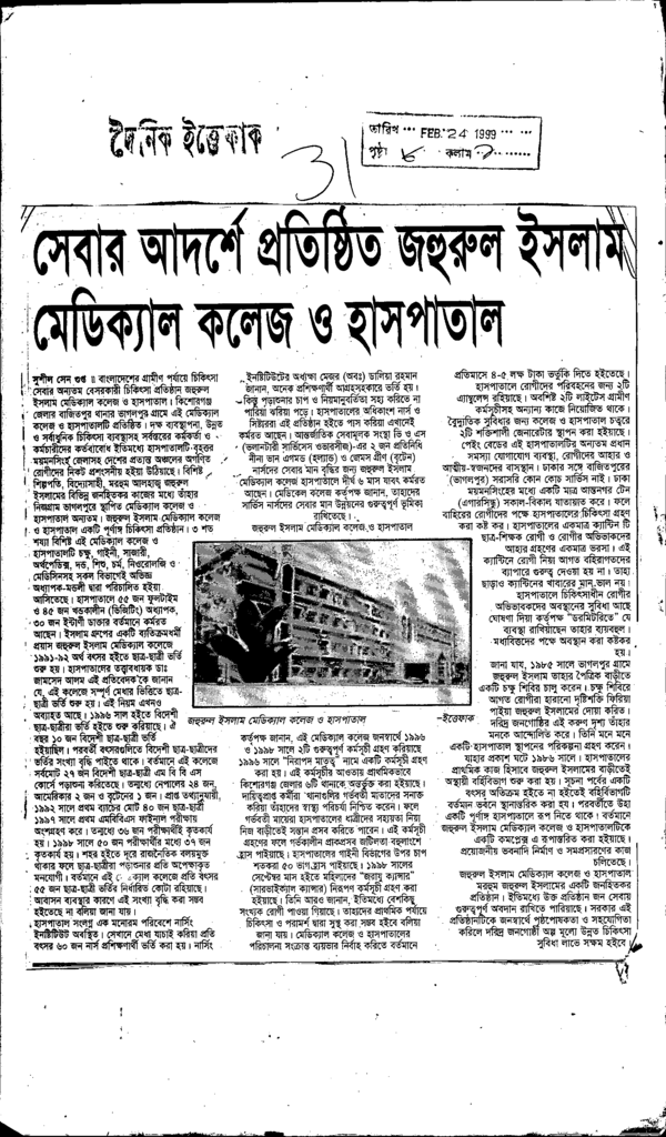 সেবার আদর্শে প্রতিষ্ঠিত জহুরুল ইসলাম মেডিক্যাল কলেজ ও হাসপাতাল Published on Newspaper দৈনিক ইত্তেফাক Category Professional Education Professional Education Medical Download