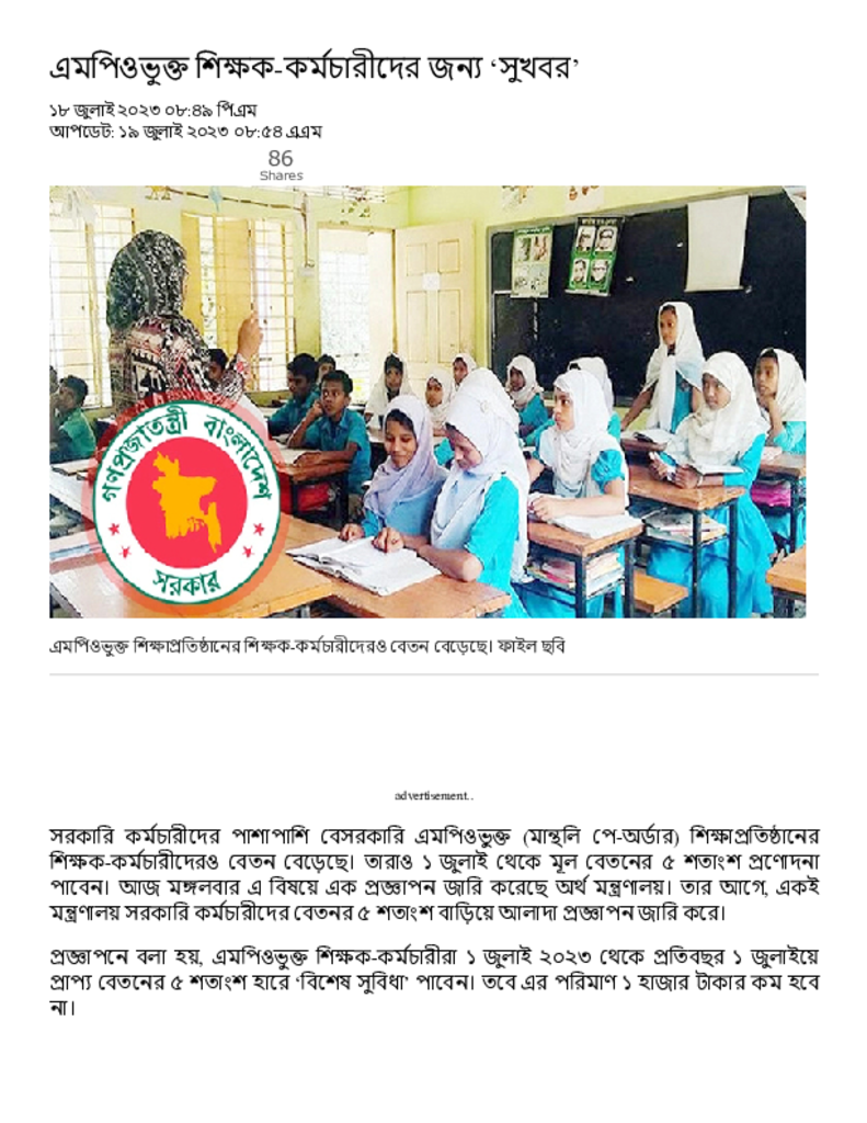 এমপিওভুক্ত শিক্ষক-কর্মচারীদের জন্য ‘সুখবর’ – Dainik Amader Shomoy.pdf Published on 18 July 2023 Newspaper দৈনিক আমাদের সময় Category Educational Ministry / Departments Download