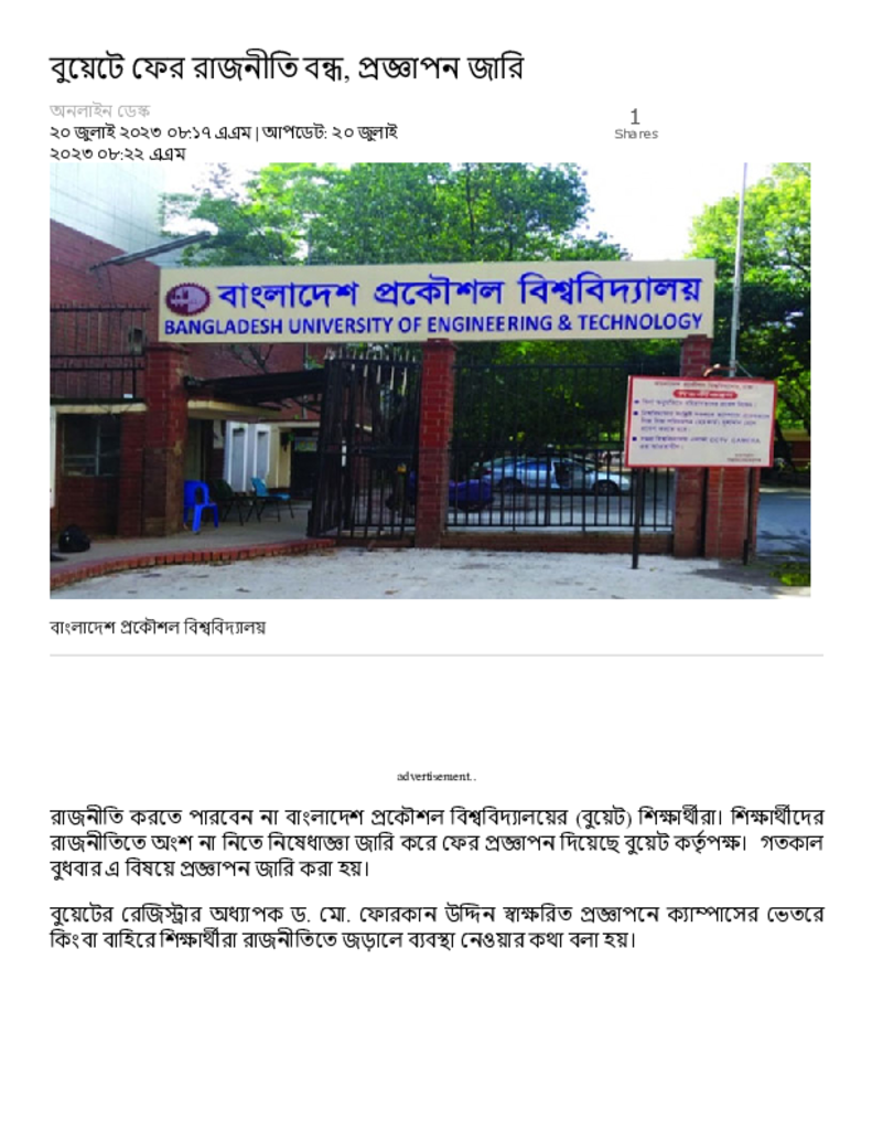 বুয়েটে ফের রাজনীতি বন্ধ, প্রজ্ঞাপন জারি – Dainik Amader Shomoy.pdf Published on 20 July 2023 Newspaper দৈনিক আমাদের সময় Category Student Politics Download