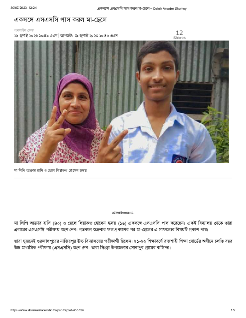 একসঙ্গে এসএসসি পাস করল মা-ছেলে – Dainik Amader Shomoy Published on 29 July 2023 Newspaper দৈনিক আমাদের সময় Category Public Examination Public Examination SSC Download