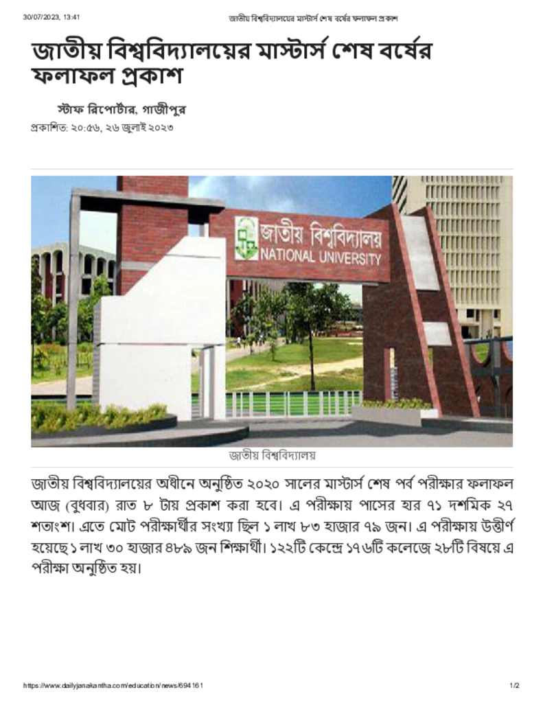 জাতীয় বিশ্ববিদ্যালয়ের মাস্টার্স শেষ বর্ষের ফলাফল প্রকাশ Published on 26 July 2023 Newspaper দৈনিক জনকণ্ঠ Category General Education General Education Public Examination Higher Education Download