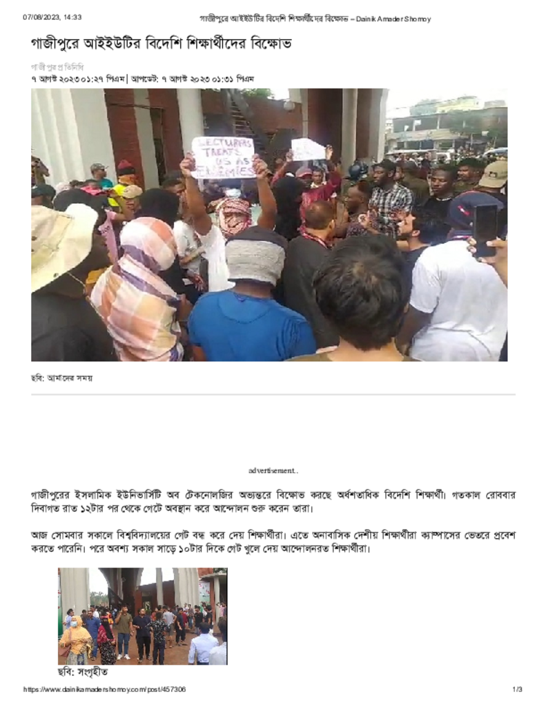 গাজীপুরে আইইউটির বিদেশি শিক্ষার্থীদের বিক্ষোভ – Dainik Amader Shomoy Published on 07 August 2023 Newspaper দৈনিক আমাদের সময় Category Others General Education Download