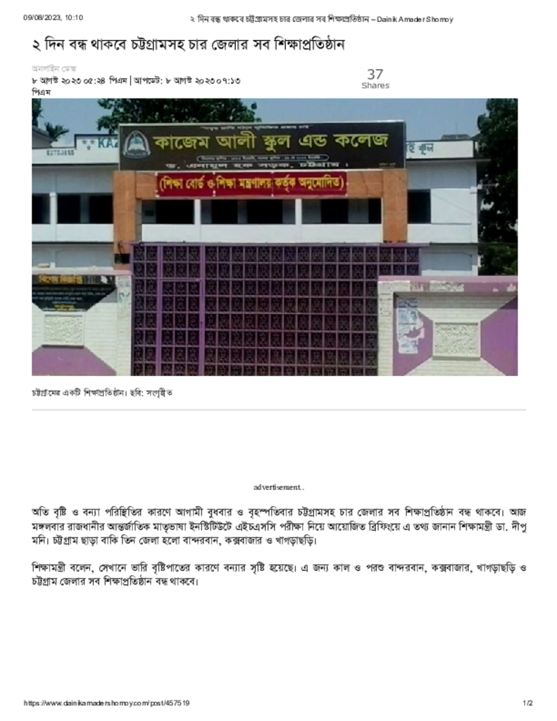 ২ দিন বন্ধ থাকবে চট্টগ্রামসহ চার জেলার সব শিক্ষাপ্রতিষ্ঠান – Dainik Amader Shomoy Published on 08 August 2023 Newspaper দৈনিক আমাদের সময় Category Educational Ministry / Departments Download