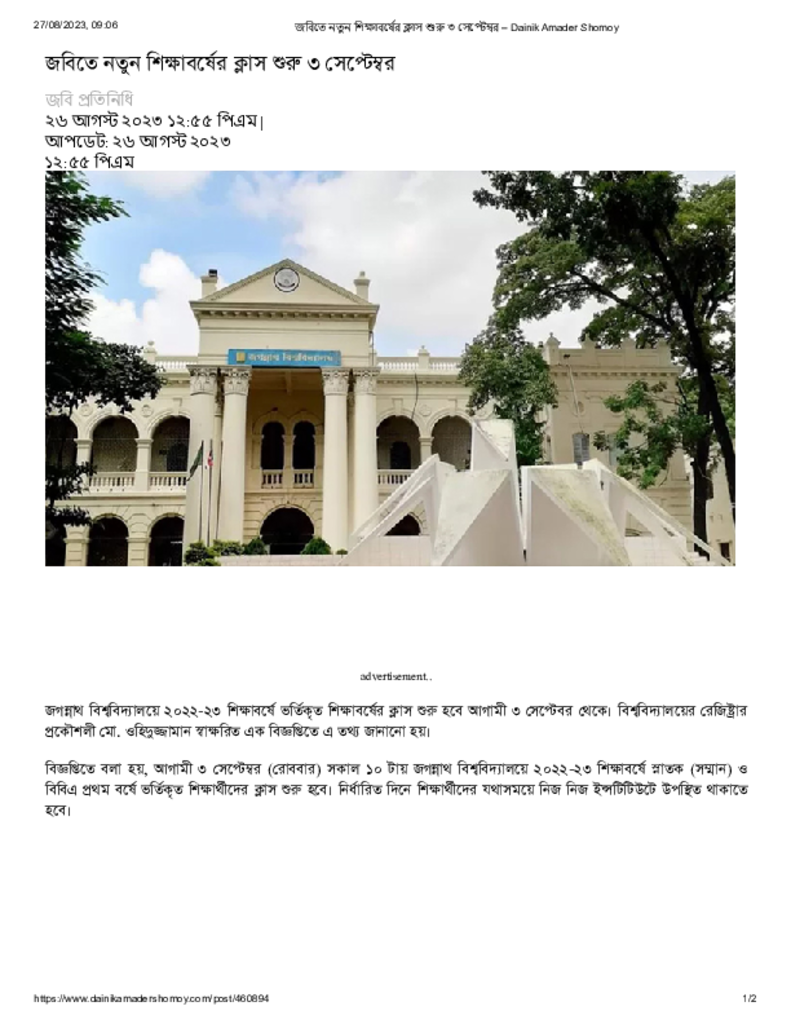 জবিতে নতুন শিক্ষাবর্ষের ক্লাস শুরু ৩ সেপ্টেম্বর – Dainik Amader Shomoy Published on 26 August 2023 Newspaper দৈনিক আমাদের সময় Category General Education General Education Higher Education Public Download