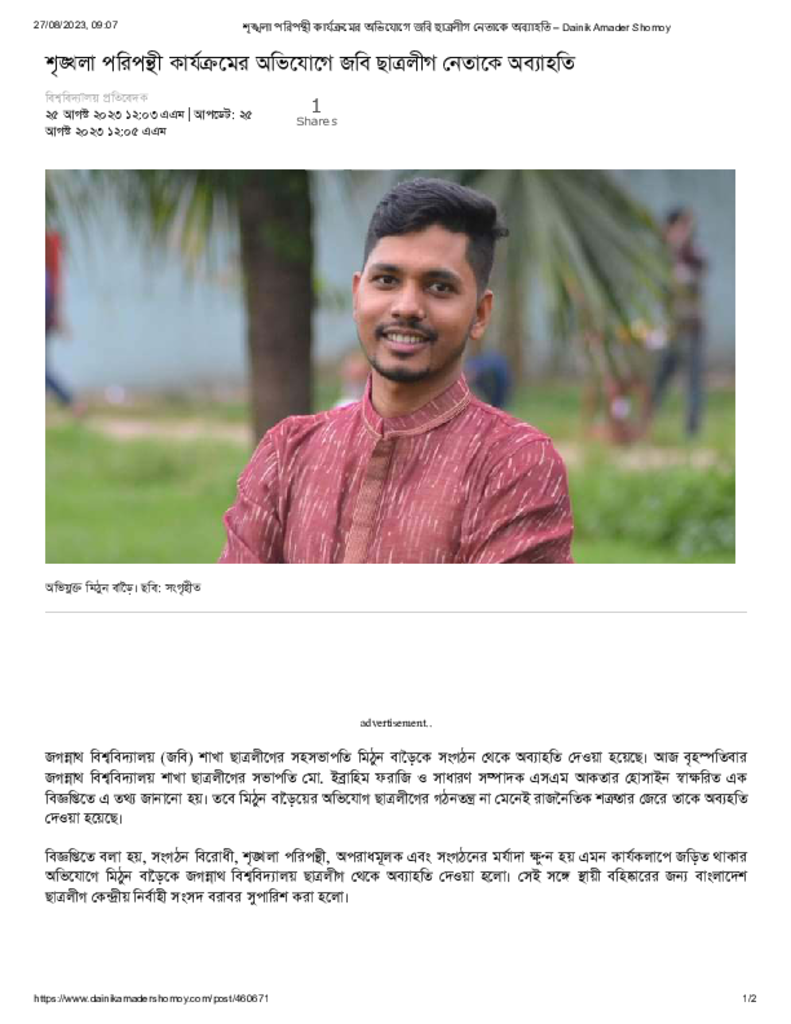 শৃঙ্খলা পরিপন্থী কার্যক্রমের অভিযোগে জবি ছাত্রলীগ নেতাকে অব্যাহতি – Dainik Amader Shomoy Published on 25 August 2023 Newspaper দৈনিক আমাদের সময় Category Student Politics General Education Download