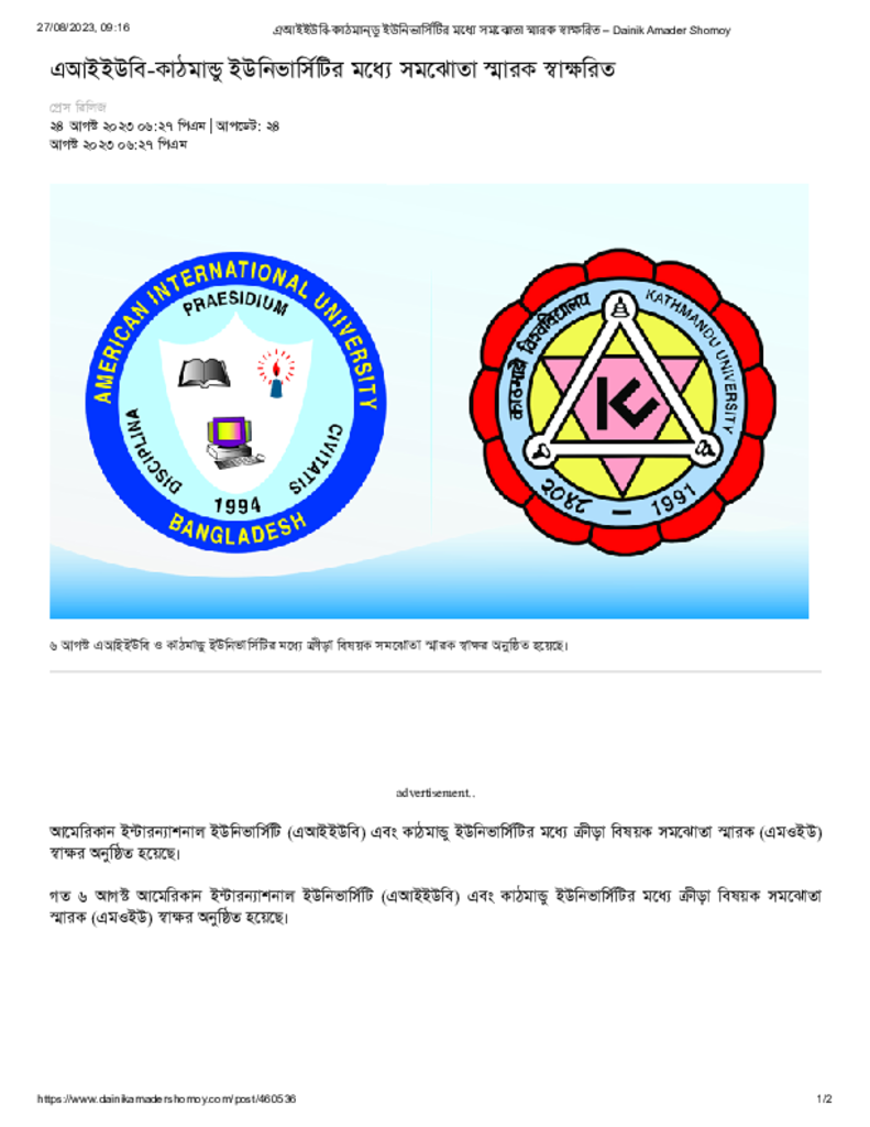 এআইইউবি-কাঠমান্ডু ইউনিভার্সিটির মধ্যে সমঝোতা স্মারক স্বাক্ষরিত – Dainik Amader Shomoy Published on 24 August 2023 Newspaper দৈনিক আমাদের সময় Category Others General Education Download