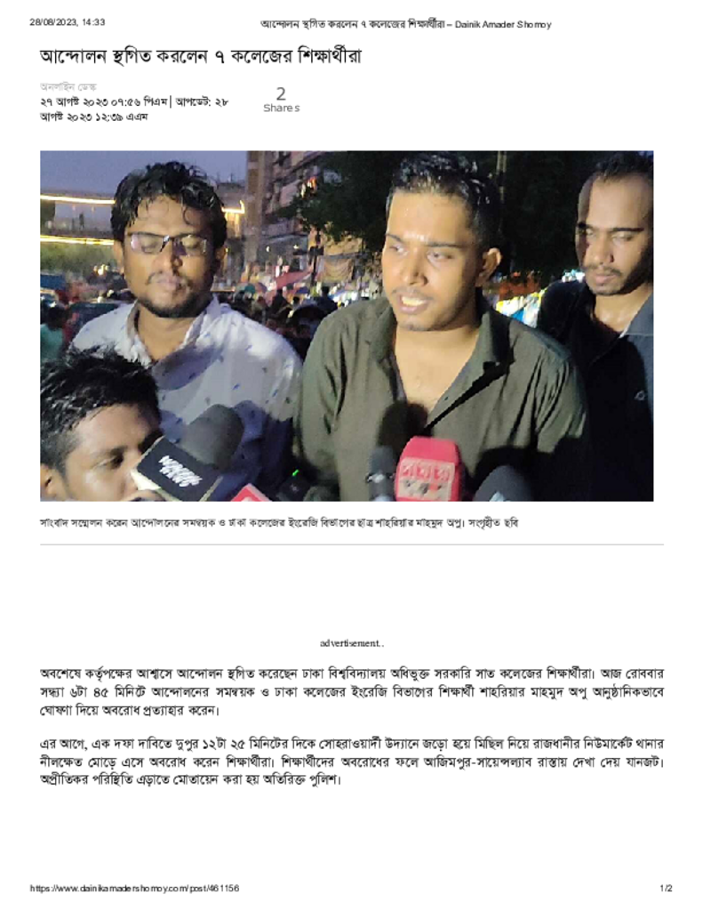 আন্দোলন স্থগিত করলেন ৭ কলেজের শিক্ষার্থীরা – Dainik Amader Shomoy Published on 27 August 2023 Newspaper দৈনিক আমাদের সময় Category Others General Education Download
