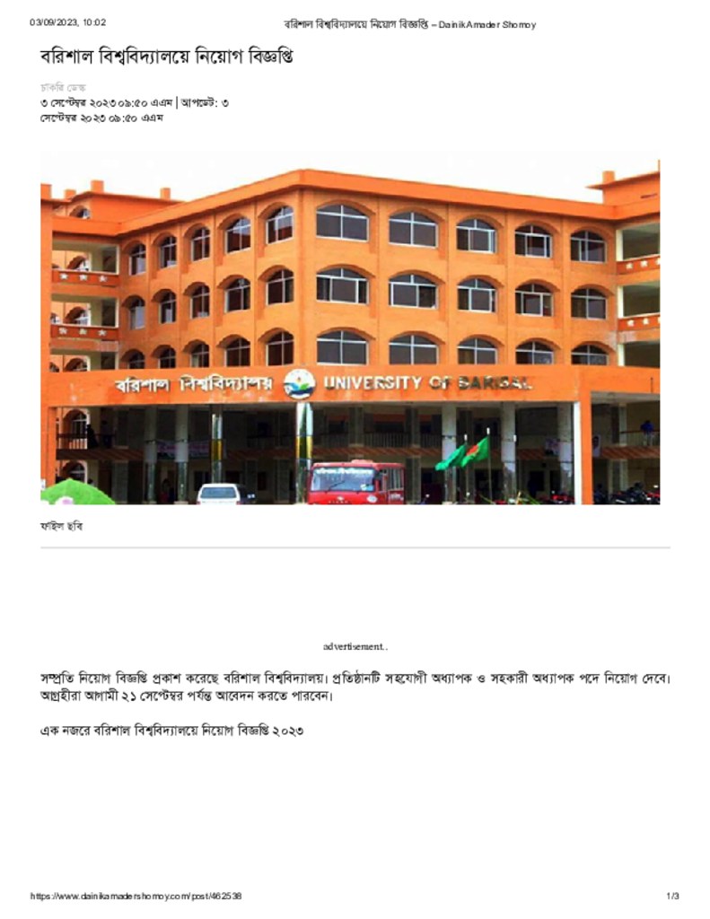 বরিশাল বিশ্ববিদ্যালয়ে নিয়োগ বিজ্ঞপ্তি – Dainik Amader Shomoy Published on 03 September 2023 Newspaper দৈনিক আমাদের সময় Category General Education General Education Higher Education Public Download