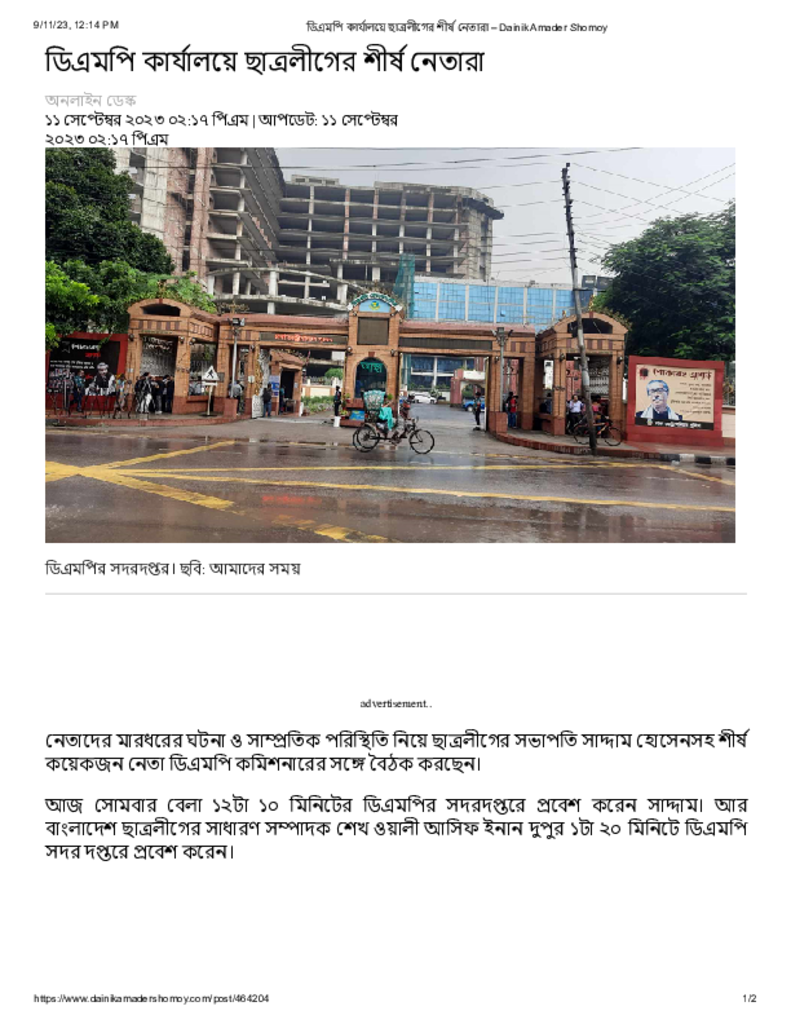 ডিএমপি কার্যালয়ে ছাত্রলীগের শীর্ষ নেতারা – Dainik Amader Shomoy.pdf Published on 11 September 2023 Newspaper দৈনিক আমাদের সময় Category Student Politics General Education Download