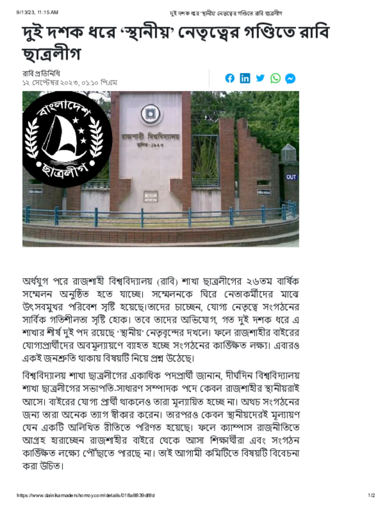 দুই দশক ধরে _‘স্থানীয়’ নেতৃত্বের গণ্ডিতে রাবি ছাত্রলীগ.pdf Published on 12 September 2023 Newspaper দৈনিক আমাদের সময় Category Student Politics General Education Download