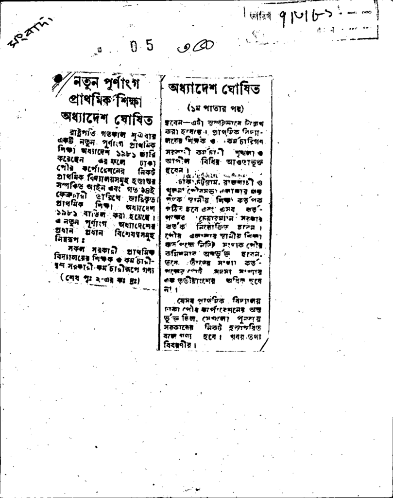 নতুন পূনাংগ প্রাথমিক শিক্ষা অ্ধ্যাদেশ ঘোষিত