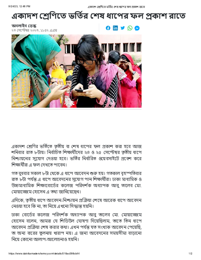 একাদশ শ্রেণিতে ভর্তির শেষ ধাপের ফল প্রকাশ রাতে Published on 23 September 2023 Newspaper দৈনিক আমাদের সময় Category Admission / Seat Problem Admission/Seat Problem Download