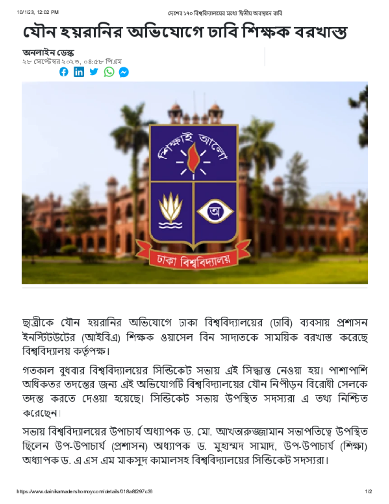 যৌন হয়রানির অভিযোগে ঢাবি শিক্ষক বরখাস্ত Published on 28 September 2023 Newspaper দৈনিক আমাদের সময় Category Others General Education Download
