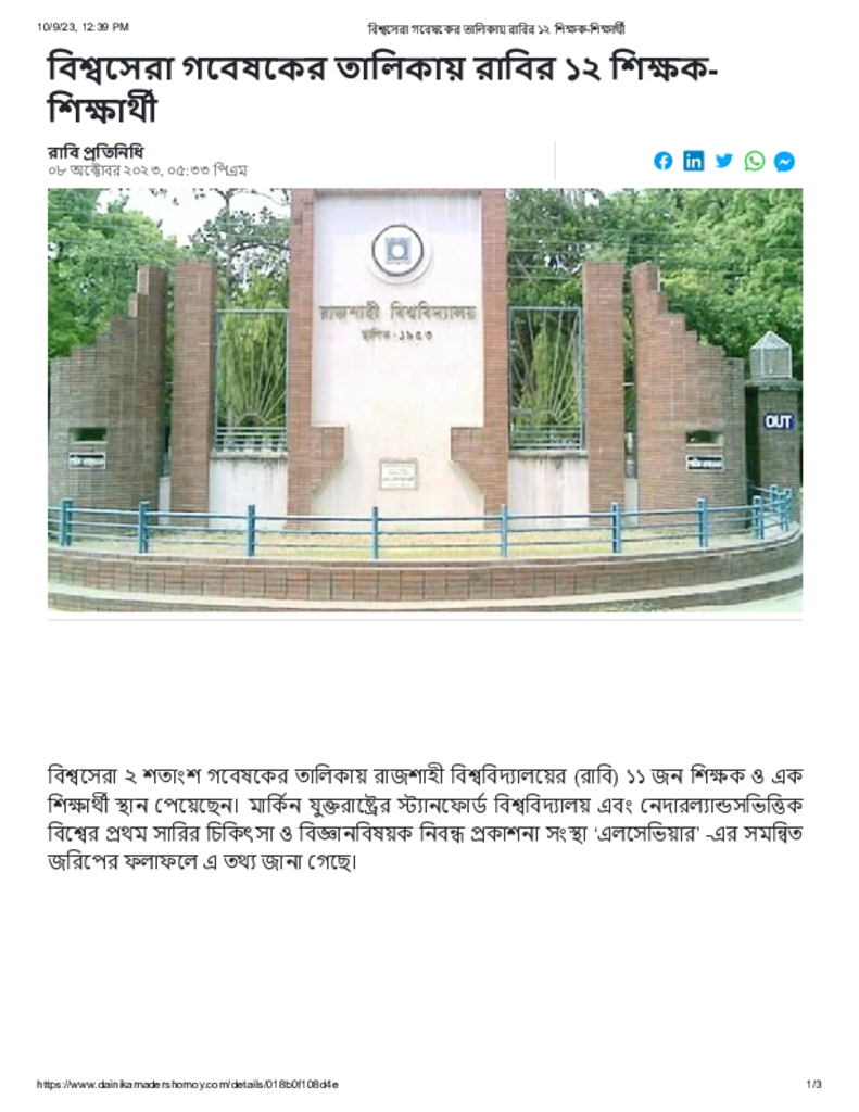 বিশ্বসেরা গবেষকের তালিকায় রাবির ১২ শিক্ষক-শিক্ষার্থী Published on 08 October 2023 Newspaper দৈনিক আমাদের সময় Category General Education General Education Higher Education Public Download