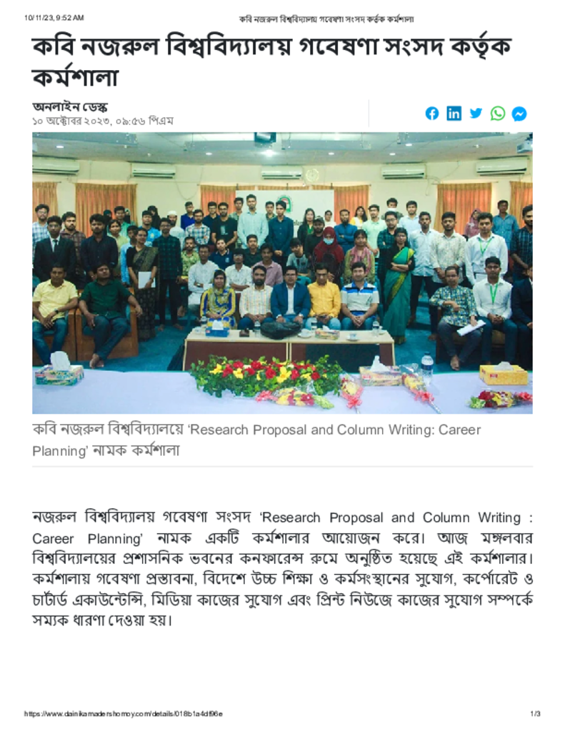 কবি নজরুল বিশ্ববিদ্যালয় গবেষণা সংসদ কর্তৃক কর্মশালা Published on 10 October 2023 Newspaper দৈনিক আমাদের সময় Category General Education General Education Higher Education Public Download
