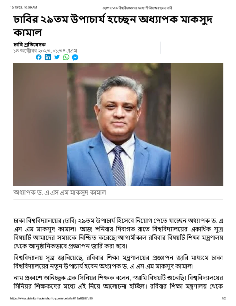 ঢাবির ২৯তম উপাচার্য হচ্ছেন অধ্যাপক মাকসুদ কামাল Published on 14 October 2023 Newspaper দৈনিক আমাদের সময় Category Educational Ministry / Departments General Education Higher Education Public Download