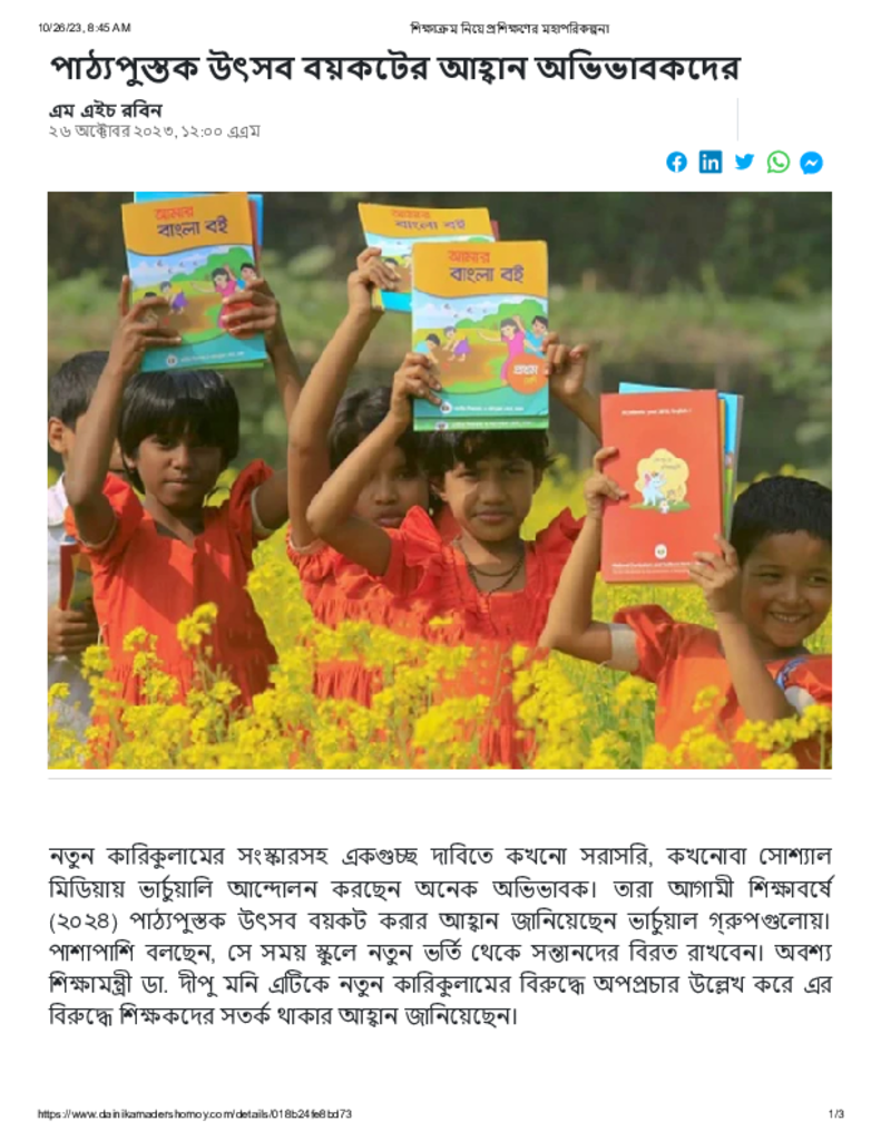 পাঠ্যপুস্তক উৎসব বয়কটের আহ্বান অভিভাবকদের.pdf Published on 26 October 2023 Newspaper দৈনিক আমাদের সময় Category Personal Opinion / Discussion / Commentary Download