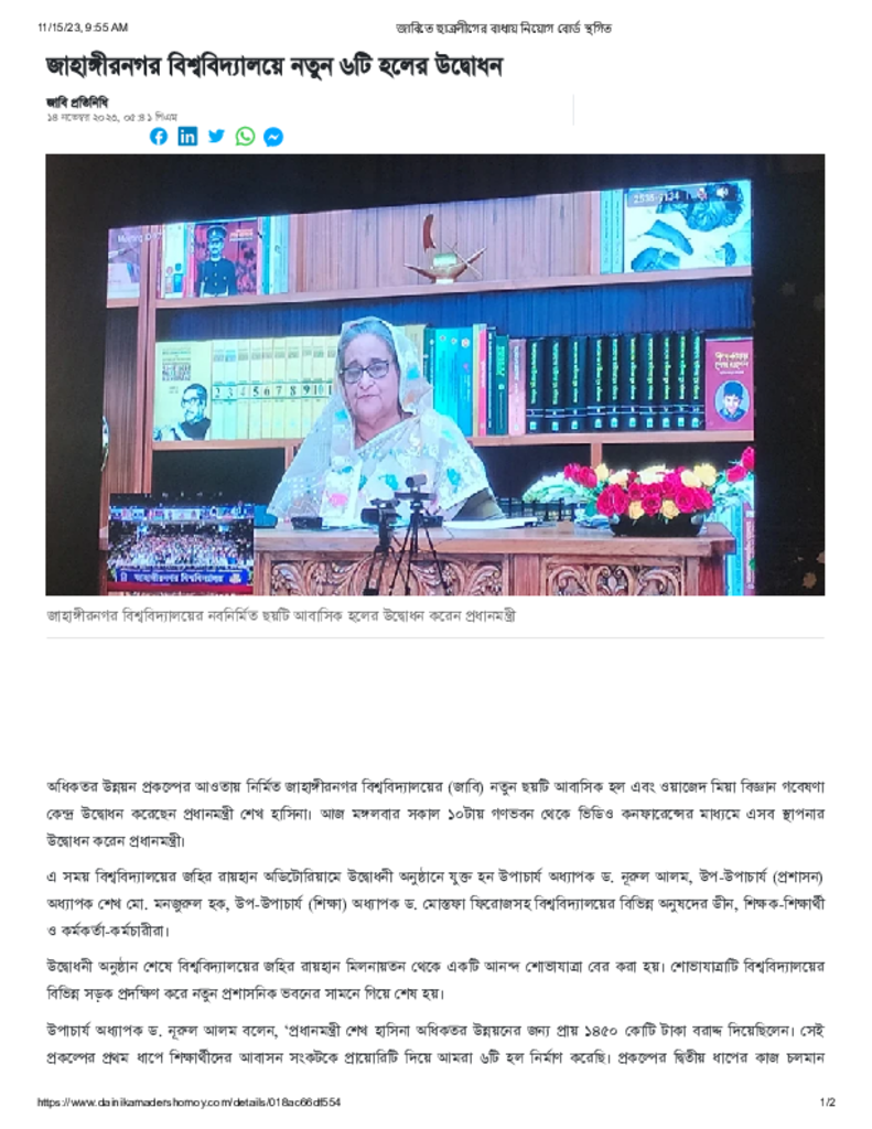 জাহাঙ্গীরনগর বিশ্ববিদ্যালয়ে নতুন ৬টি হলের উদ্বোধন Published on 15 November 2023 Newspaper দৈনিক আমাদের সময় Category Educational Ministry / Departments General Education Download