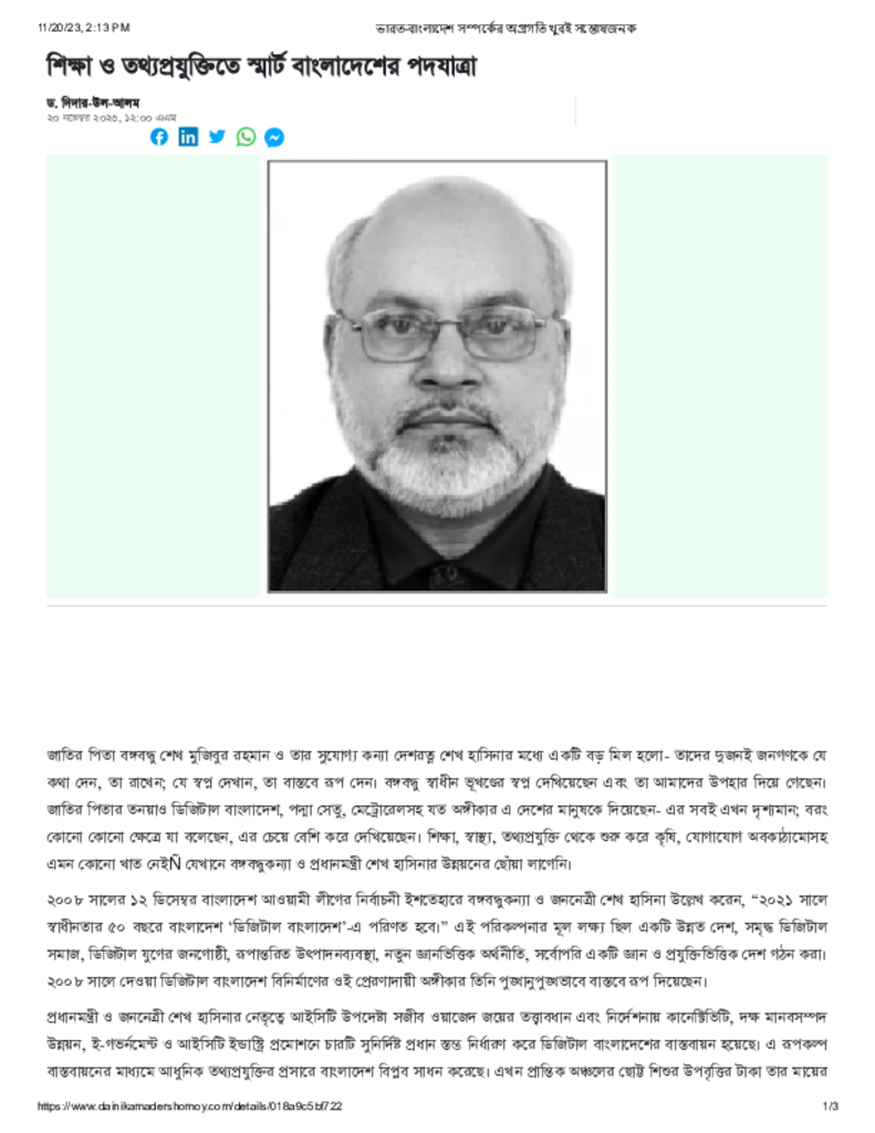 শিক্ষা ও তথ্যপ্রযুক্তিতে স্মার্ট বাংলাদেশের পদযাত্রা Published on 20 November 2023 Newspaper দৈনিক আমাদের সময় Category Personal Opinion / Discussion / Commentary Download