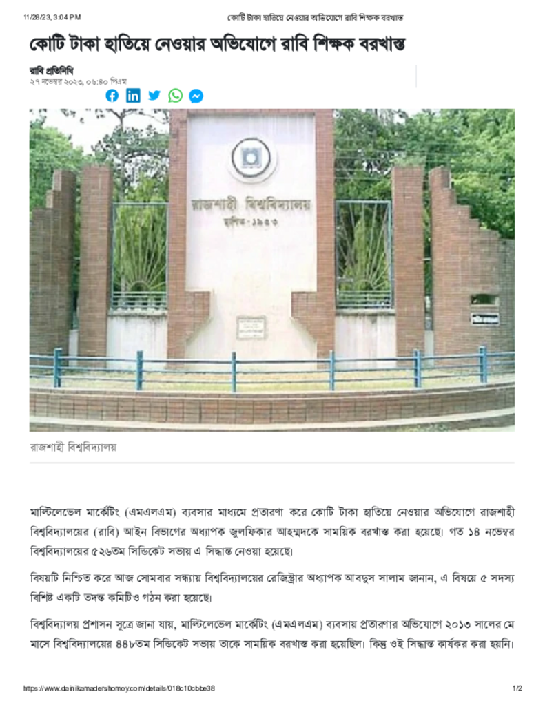 কোটি টাকা হাতিয়ে নেওয়ার অভিযোগে রাবি শিক্ষক বরখাস্ত Published on 27 November 2023 Newspaper দৈনিক আমাদের সময় Category Others Download