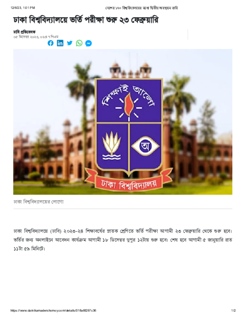 ঢাকা বিশ্ববিদ্যালয়ে ভর্তি পরীক্ষা শুরু ২৩ ফেব্রুয়ারি Published on 05 December 2023 Newspaper দৈনিক আমাদের সময় Category Admission / Seat Problem General Education Higher Education Public Download
