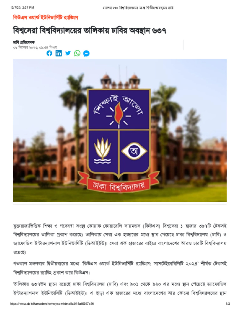 বিশ্বসেরা বিশ্ববিদ্যালয়ের তালিকায় ঢাবির অবস্থান ৬৩৭ Published on 06 December 2023 Newspaper দৈনিক আমাদের সময় Category General Education General Education Higher Education Public Download