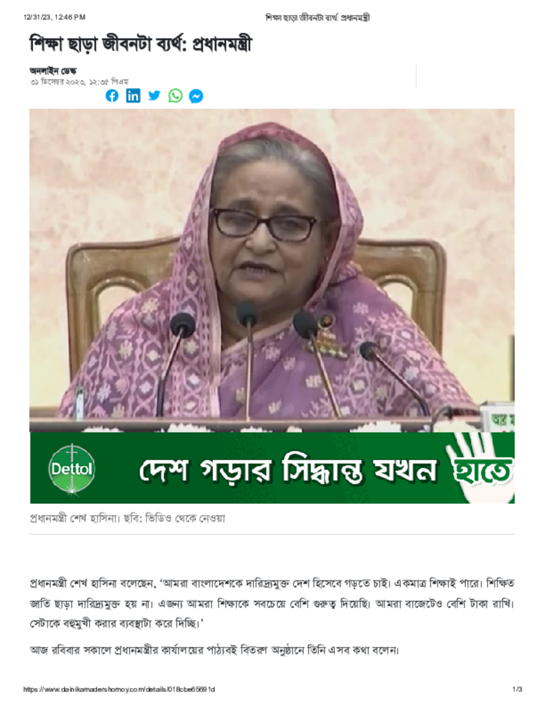 শিক্ষা ছাড়া জীবনটা ব্যর্থ_ প্রধানমন্ত্রী Published on 31 December 2023 Newspaper দৈনিক আমাদের সময় Category Personal Opinion / Discussion / Commentary Download