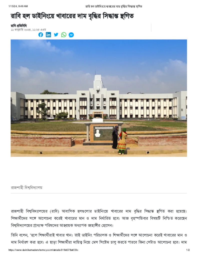 রাবি হল ডাইনিংয়ে খাবারের দাম বৃদ্ধির সিদ্ধান্ত স্থগিত Published on 11 January 2024 Newspaper দৈনিক আমাদের সময় Category Others General Education Download