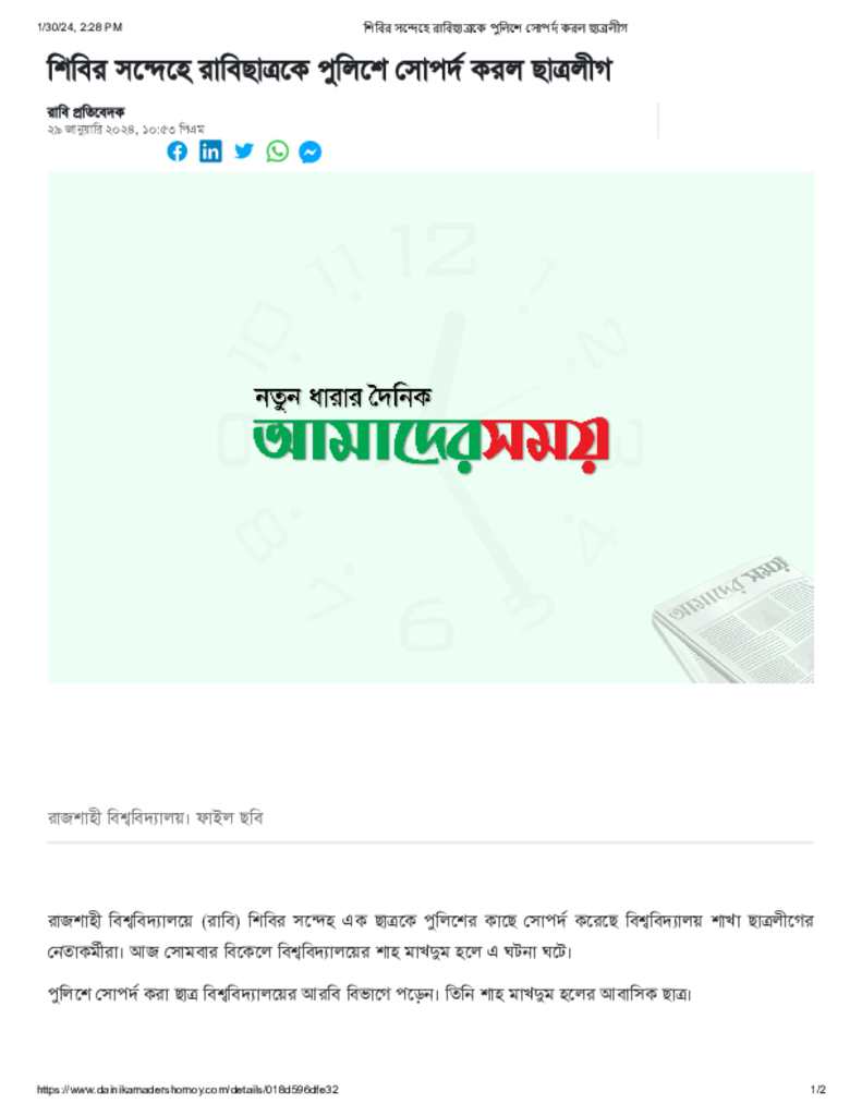 শিবির সন্দেহে রাবিছাত্রকে পুলিশে সোপর্দ করল ছাত্রলীগ Published on 29 January 2024 Newspaper দৈনিক আমাদের সময় Category Student Politics General Education Download