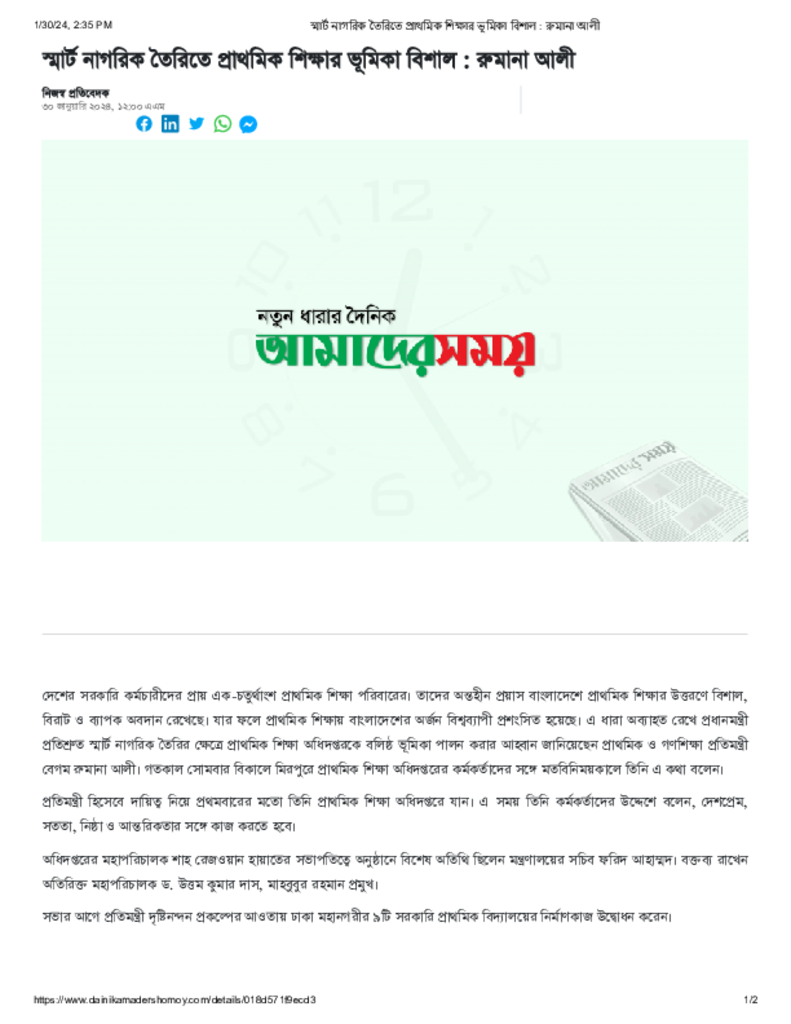 স্মার্ট নাগরিক তৈরিতে প্রাথমিক শিক্ষার ভূমিকা বিশাল _ রুমানা আলী Published on 30 January 2024 Newspaper দৈনিক আমাদের সময় Category Educational Ministry / Departments Download