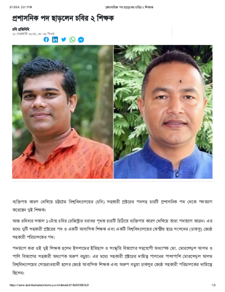 প্রশাসনিক পদ ছাড়লেন চবির ২ শিক্ষক Published on 11 February 2024 Newspaper দৈনিক আমাদের সময় Category General Education General Education Higher Education Public Download