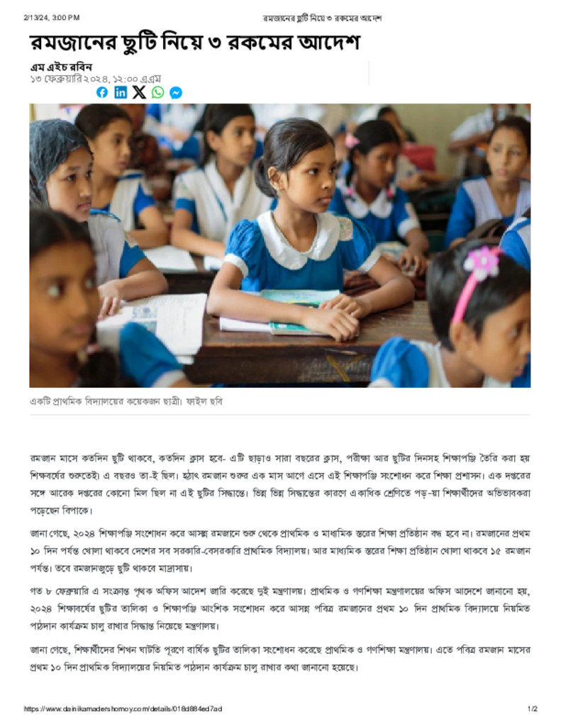 রমজানের ছুটি নিয়ে ৩ রকমের আদেশ Published on 13 February 2024 Newspaper দৈনিক আমাদের সময় Category Educational Ministry / Departments Download