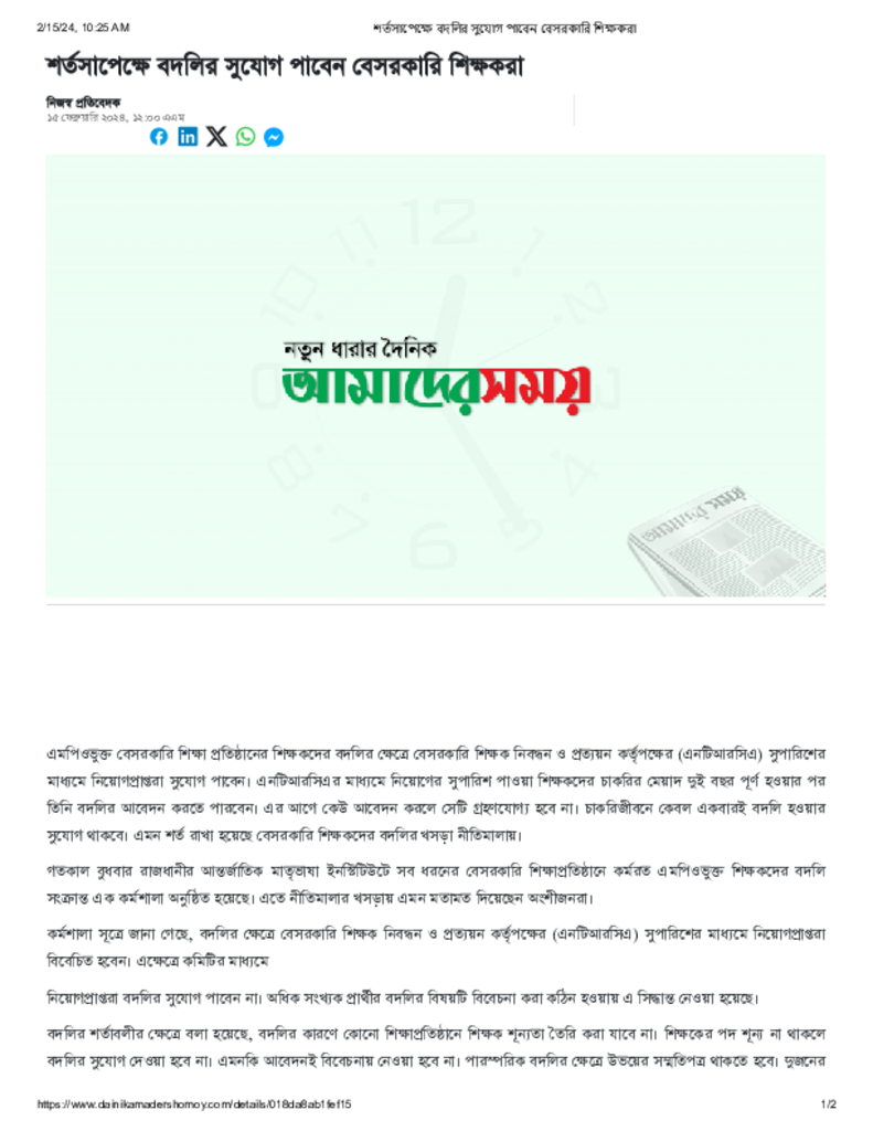 শর্তসাপেক্ষে বদলির সুযোগ পাবেন বেসরকারি শিক্ষকরা Published on 15 February 2024 Newspaper দৈনিক আমাদের সময় Category Educational Ministry / Departments Download
