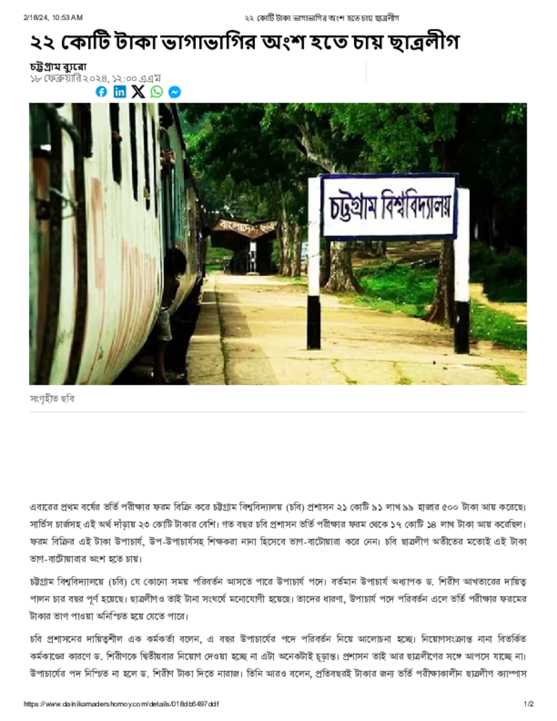 ২২ কোটি টাকা ভাগাভাগির অংশ হতে চায় ছাত্রলীগ Published on 18 February 2024 Newspaper দৈনিক আমাদের সময় Category Student Politics General Education Download