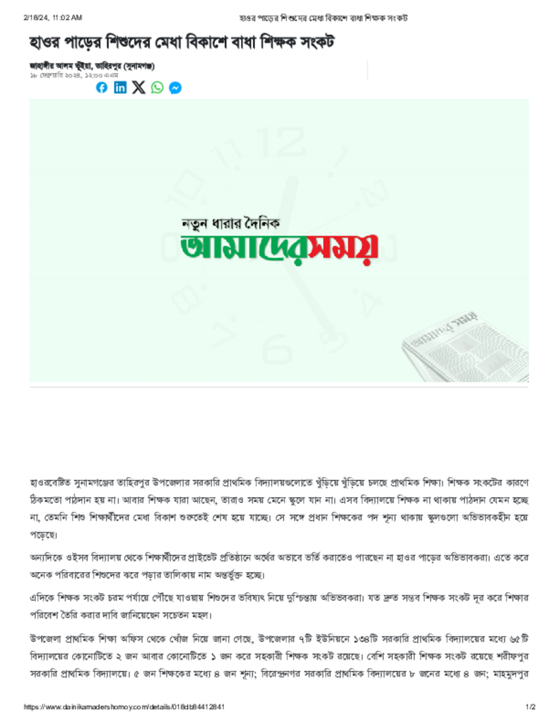 হাওর পাড়ের শিশুদের মেধা বিকাশে বাধা শিক্ষক সংকট Published on 18 February 2024 Newspaper দৈনিক আমাদের সময় Category Personal Opinion / Discussion / Commentary Download