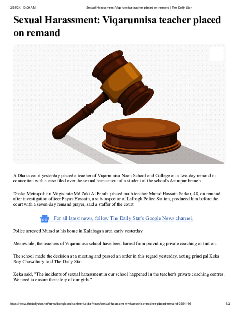 Sexual Harassment_ Viqarunnisa teacher placed on remand _ The Daily Star