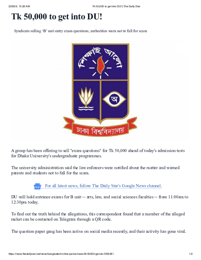 Tk 50,000 to get into DU! _ The Daily Star Published on 23 February 2024 Newspaper The Daily Star Category Admission / Seat Problem General Education Download