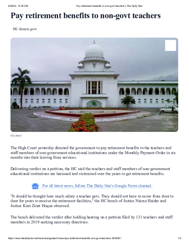 Pay retirement benefits to non-govt teachers _ The Daily Star