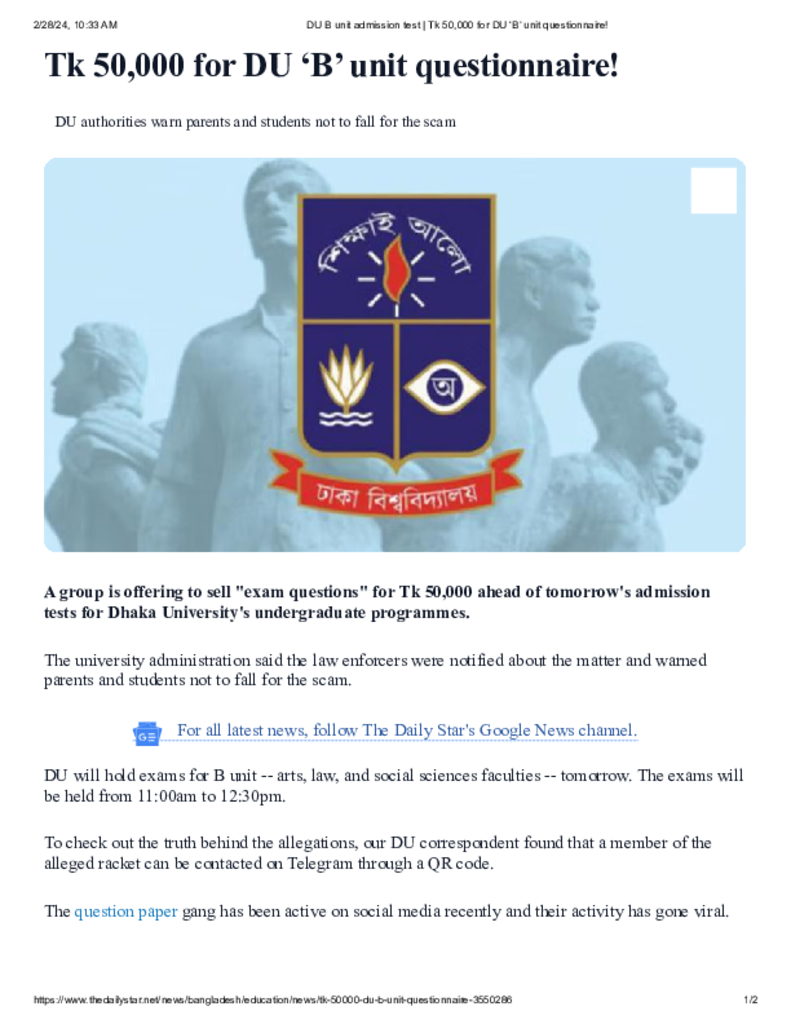 DU B unit admission test _ Tk 50,000 for DU ‘B’ unit questionnaire! Published on 22 February 2024 Newspaper The Daily Star Category Admission / Seat Problem General Education Download